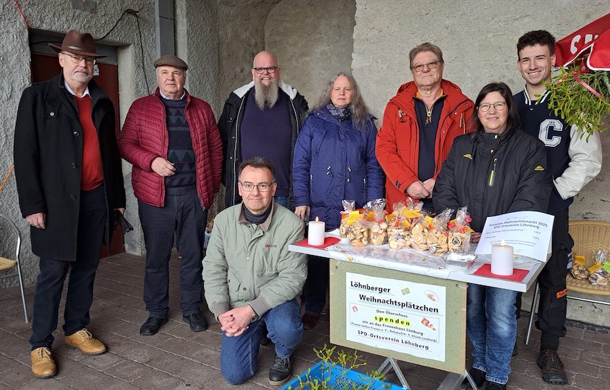 Foto: Einige der Kandidaten auf dem Weihnachtsmarkt (v. l.): Gerold Zipp, Volker Weber, Achim Schaad, Anne Lawall-Schaad, Knud Zilian, Sandra Schuster, Nils Schuster und kniend Frank Schuster