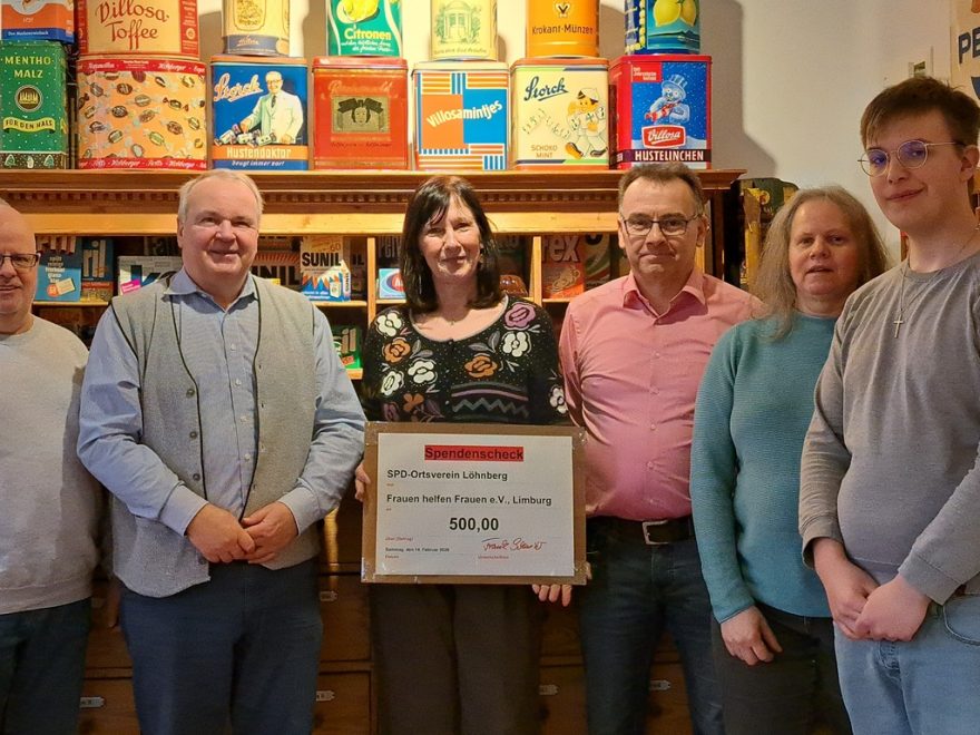 Auf dem Weihnachtsmarkt 2025 verkauften die Aktiven des SPD Ortsvereins Löhnberg selbstgebackene Weihnachtsplätzchen. Wie damals angekündigt, wurde der Überschuss jetzt an das Frauenhaus in Limburg gespendet. 350 € waren so zusammengekommen, die aus Reihen der SPD auf 500 € aufgestockt wurden.